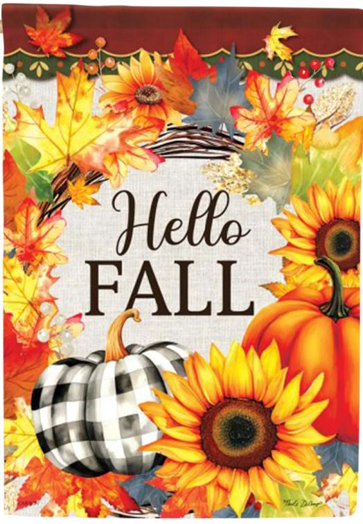 Celebrate autumn with this charming flag featuring a vibrant wreath of golden sunflowers and fall leaves. The "Hello FALL" greeting is framed by cheerful blooms, buffalo check pumpkins, and wheat stalks against a rich rust background. Red berry garland adds festive detail to this farmhouse-inspired design, perfect for welcoming the harvest season with style and warmth.