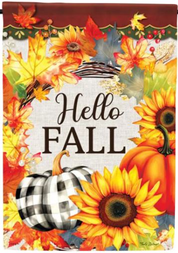 Welcome the season with this cheerful garden flag featuring a beautiful wreath of autumn leaves in vibrant fall colors, bright sunflowers, and colorful blooms. A trendy black and white buffalo check pumpkin and orange pumpkin add farmhouse charm to this festive "Hello FALL" design adorned with red berries.